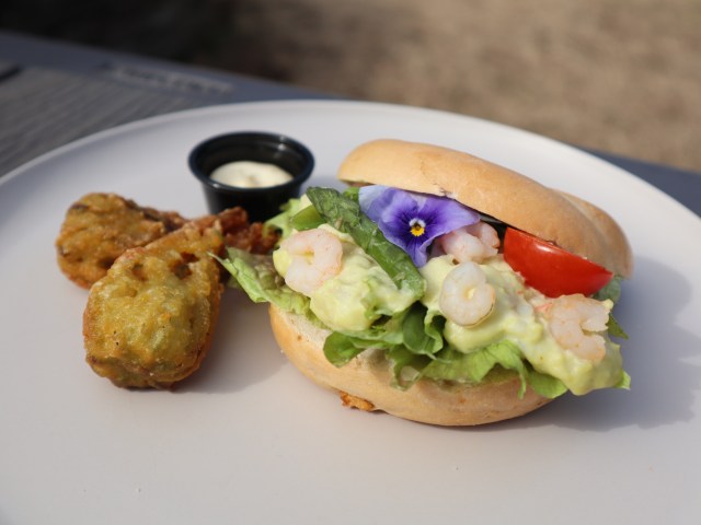 ▼ Shrimp and Avocado Salad Spring Vegetable Bagel Sandwich with Italian vegetable fritters (900 yen)