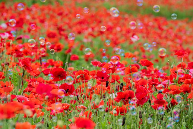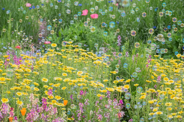 Twice a day on April 2, April 25, and May 16, the park releases thousands of soap bubbles over the flower fields to create a fantastical landscape.