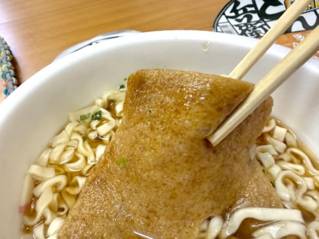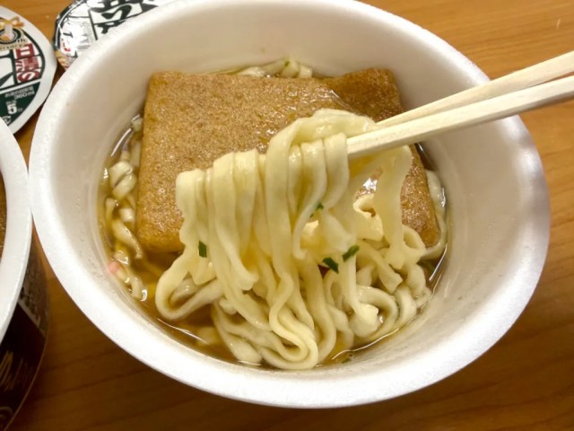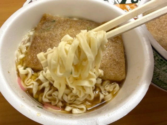 Both the Classic and current kitsune udon take the same five minutes to cook after you add boiling water, and as soon as we picked up a mouthful of noodles with our chopsticks, we could see that they’re thinner for Classic udon than they are for the modern version.