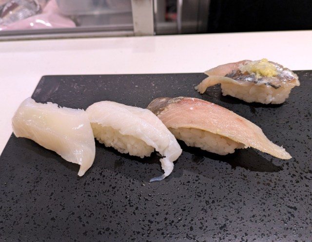 However, rather than leave the selection up to the chef to decide on, we wanted to pick our own kinds of fish, and we started with four pieces from the middle of the menu’s per-piece price range.