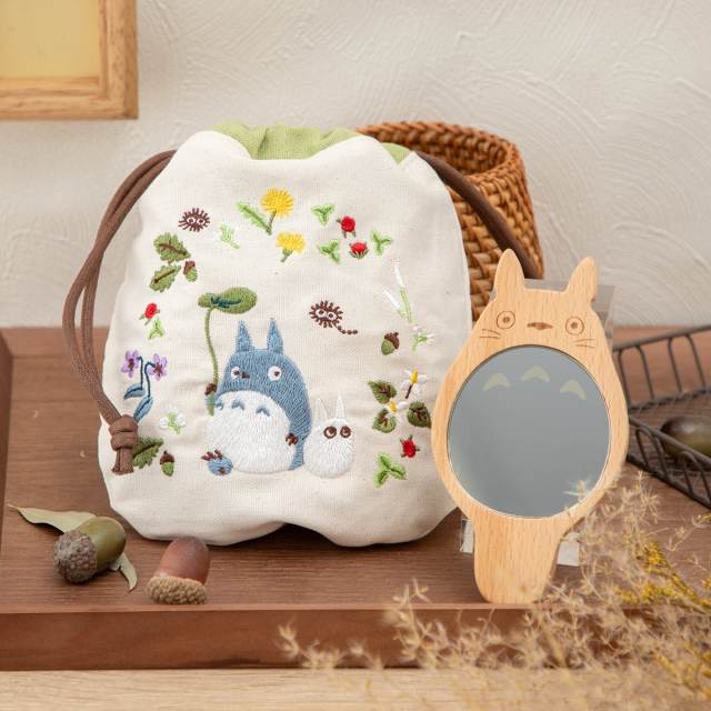 ▼ A Totoro-shaped hand mirror and a drawstring bag embroidered with spring wildflowers.