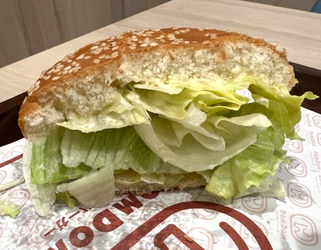 After unwrapping it, our writer was blown away by the sheer amount of lettuce. He’d wager there was probably one-third of a head of it between those buns. Even after lifting up the top of the bun, all that could be seen was lettuce.