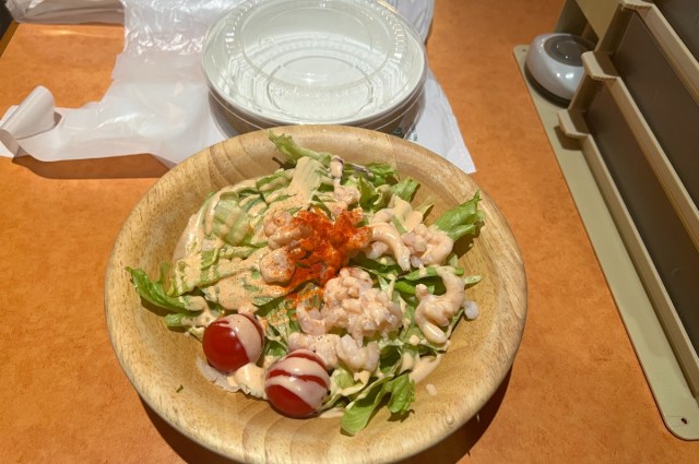 It took some digging around before Kouhey could find anything that wasn’t lettuce. There were five or six boiled shrimp and some sauce, but it didn’t amount to much this deep in a sea of lettuce.