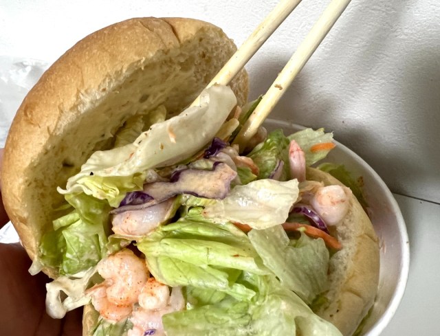 And it was just lettuce. He couldn’t even get a significant piece of bun in that first bite and just tasted a mouthful of green leaves. As he got deeper, he eventually caught the slight taste of the bun, shrimp, and mayonnaise, but they were all constantly overwhelmed by the relentless presence of lettuce.