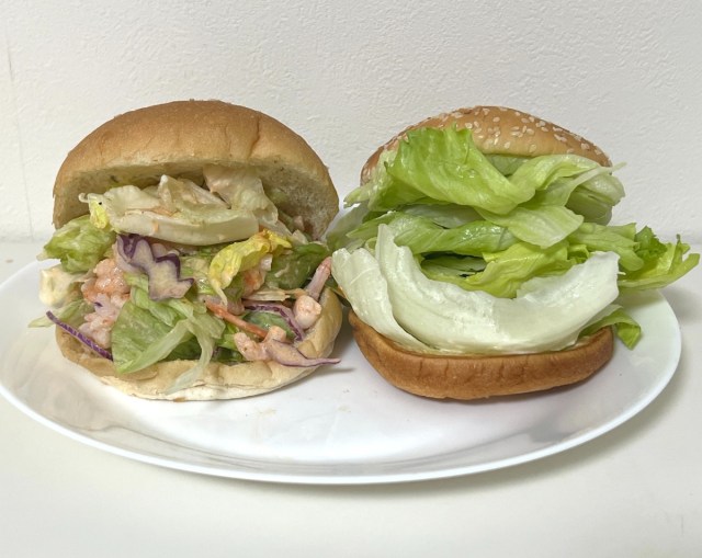 They sell a boiled shrimp salad for 350 yen, so he thought he might be able to recreate his own take on an Almost All Lettuce Burger with it.
