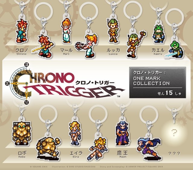 The 500-yen (US$3.25) pins are being offered as gacha capsule toys, and with 15 different versions, that might seem like a merciless degree of randomization. However, 14 of the designs are actually spread among seven characters, with stand-by and action poses for Crono, Marle, Lucca, Frog, Robo, Ayla, and Magus (or Chorno, Marl, Lucca, Kaeru, Eira, and Maoh, if you’re using their Japanese names/renderings). That still leaves one mysterious secret design, but that still means the keychain you get will randomly be one of eight, or possibly even only seven, possible characters, raising the chances of getting one of your favorites of the bunch.