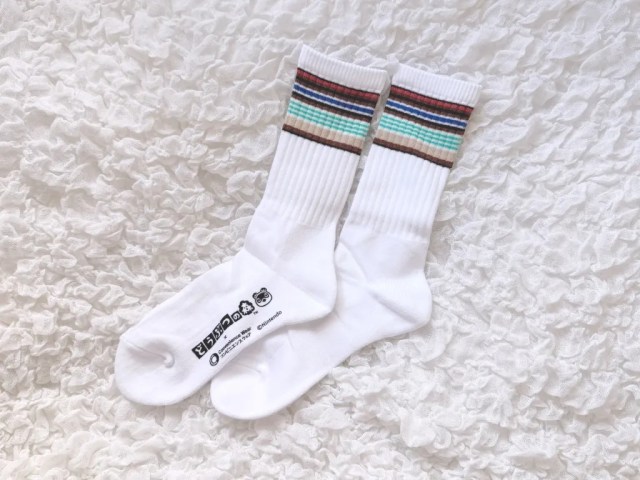 Available in both adult and kid sizes, Family Mart’s Animal Crossing socks are a clever mix of aesthetic elements. The stripes feature hues that regularly show up in the games’ color design, acting as a subtle signal to fellow fans while still looking fashionable in their own right to those unfamiliar with the source material. Printed on the lower part of the socks is an illustration of Tom Nook and the series’ in-Japanese title (どうぶつの森/Dobutsu no Mori [“Animal Forest”]. Having the more overt references to the games on the lower part of the socks makes perfect sense from a Japanese cultural perspective. Since you remove your shoes when entering a Japanese home, once you’re among friends you can feel free to unabashedly geek out together over your video game socks.