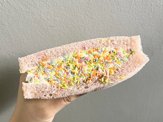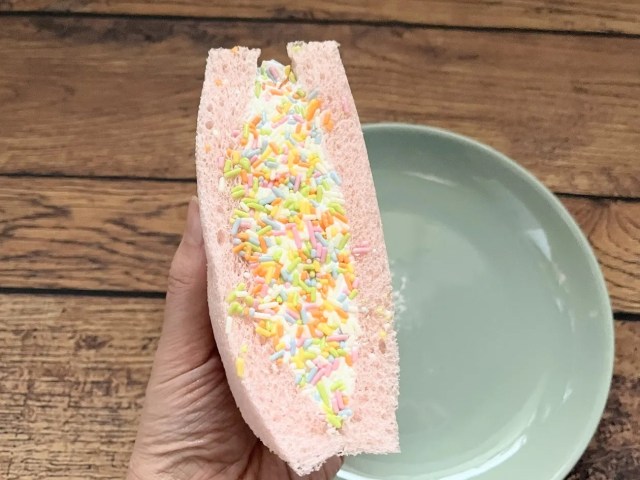 Giving the sandwich a satisfying squeeze, we could feel the thickness and softness giving way under our fingers, and we found ourselves mesmerised by its pretty appearance. It kind of resembled fairy bread, a popular children’s party food from New Zealand and Australia, but it was like fairy bread on pink party steroids – instead of scattering sprinkles on a slice of buttered bread, this one scatters them on cream and stuffs it into a sandwich.