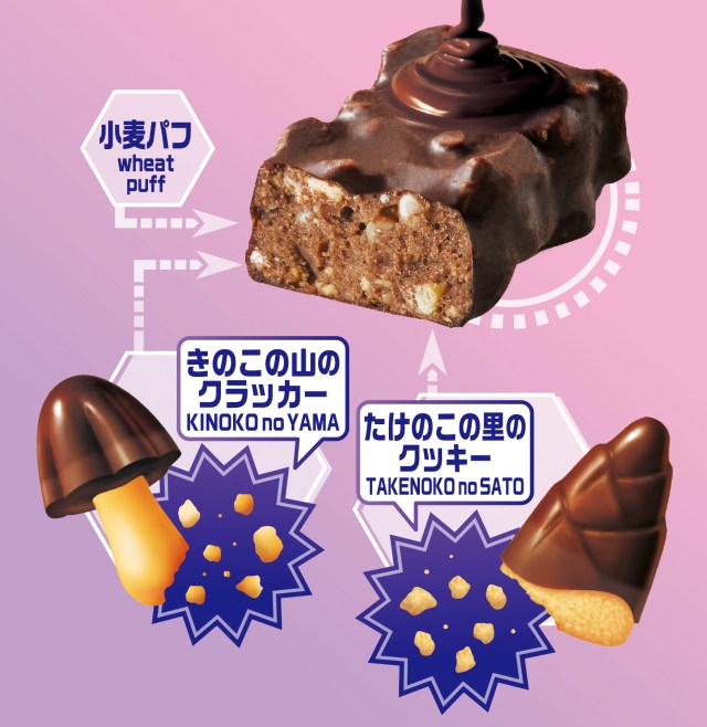 This marriage of the two snacks went on sale on 14 April, and consists of crushed bits of both Kinoko no Yama and Takenoko no Sato, suspended alongside wheat puffs in a milk-chocolate matrix, all covered in dark chocolate.