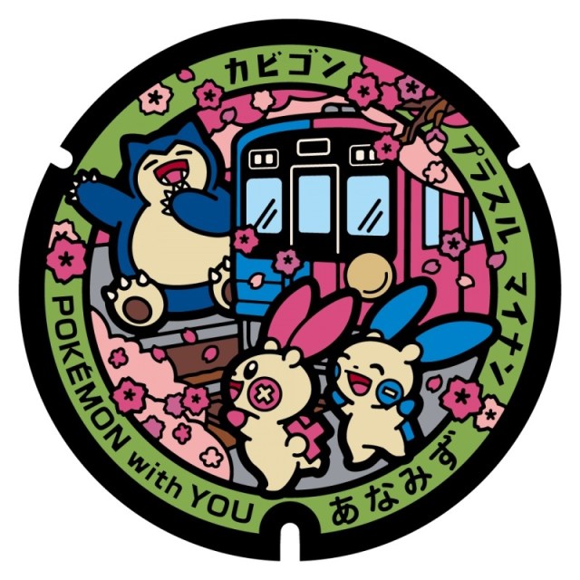 Each cover has a unique design and is located in a different town on the peninsula. Starting off, we’ve got the above scene of Snorlax, Plusle, and Minun on the Pokéfuta at Anamizu Station in the town of Anamizu, which is loved by locals for its cherry blossoms.