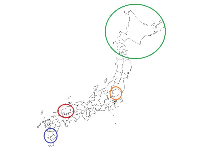 The distances between Hiroshima (circled in red on the map below), Tochigi (orange), Hokkaido (green). and Kagoshima (blue) suggest that separate fraudsters were involved in the different incidents, and that criminals in other parts of Japan might be trying out similar tactics.